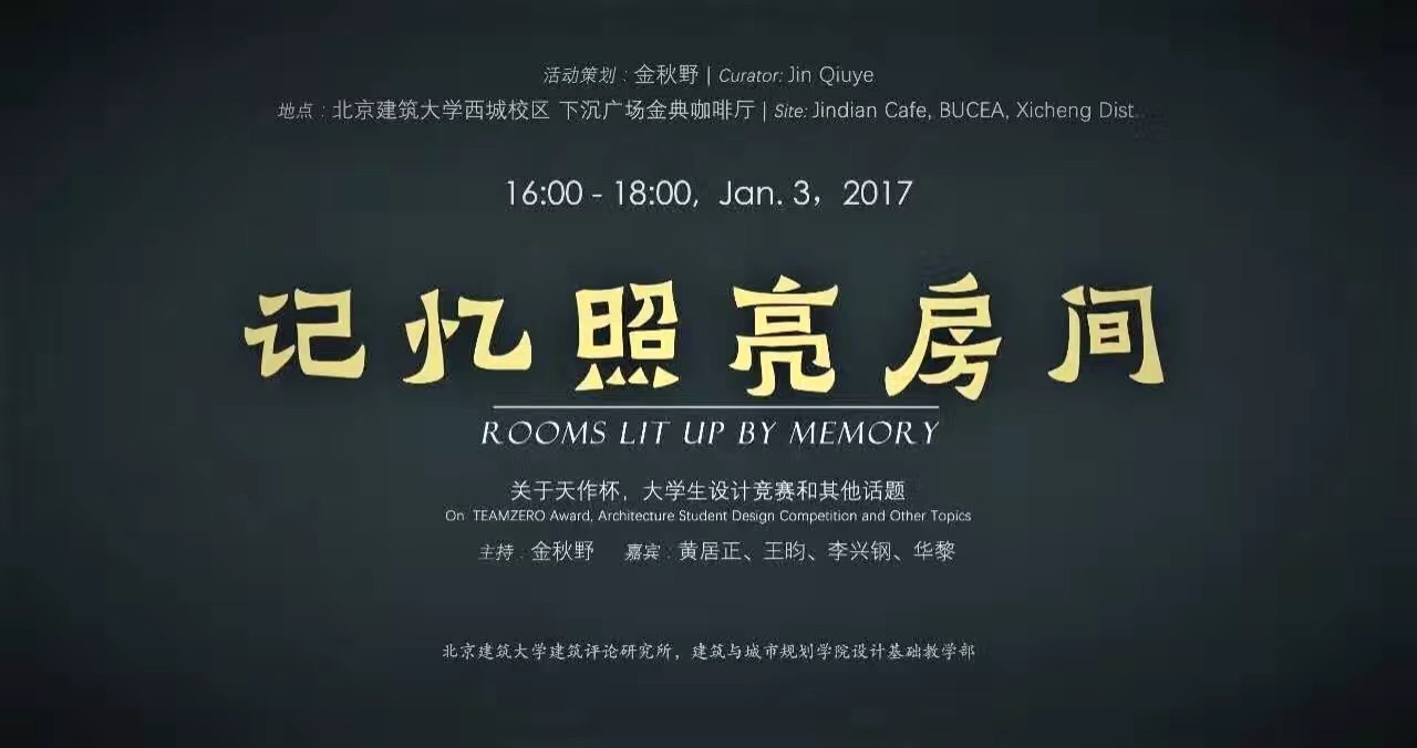 2017年1月3日16时,在努努影视 西城校区金点咖啡厅,由北京未来城市设计高精尖创新中心、努努影视 努努影视 主办,努努影视 建筑评论研究所、努努影视 团委承办的“记忆照亮房间”主题沙龙如期举行。此次沙龙活动由努努影视 金秋野教授策划,参会嘉宾包括:努努影视 副院长胡雪松、建筑学报主编黄居正,TAO迹建筑事务所创始人华黎,中国建筑设计研究院副总建筑师李兴钢,ADA研究中心主任王昀,北京建工建筑设计研究院副院长边志杰,同济大学出版社群岛工作室主持人秦蕾,以及学院青年教师程艳春、王韬、刘烨、丁光辉、郝石盟、黄庭晚、成慧祯等,沙龙由金秋野教授主持。沙龙现场大咖云集,各位主讲嘉宾均担任过各类设计竞赛的组织者、出题人或评委,此次沙龙主要以设计竞赛为中心展开讨论,分别就“如何面对竞赛”、“竞赛在学习中扮演的角色”、“竞赛与课程设计的关系”、“如何参与竞赛”、“一份好的竞赛作品是怎样的”、“竞赛所要传达的价值观”等议题展开讨论,旨在使同学们了解竞赛目的、摆正参赛心态,以及找准切入方向。