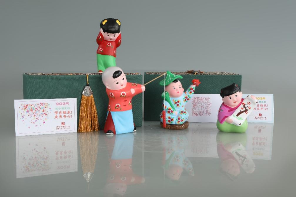 本次非遗“盲盒”礼物选取天津“泥人张”彩塑作品。天津“泥人张”彩塑是一种民间美术品,入选我国首批非物质文化遗产名录。“泥人张”历史悠久,可追溯至清代道光年间,已有两百多年的历史。“泥人张”由张明山创立,至今已经传承六代。其创作题材广泛,作品多以古典小说、民间传说、戏曲故事为创作主题。“泥人张”彩塑制作工艺流程包含,选泥、熟泥、塑形、晾干、烧制、打磨、彩绘。天津“泥人张”彩塑的特点是先塑造后绘色,用色简雅明快,用料讲究,所捏的泥人历经久远,不燥不裂,栩栩如生,在国际上享有盛誉。