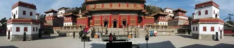 普宁寺的大殿是汉藏结合的六层高楼,正面看气势宏伟,侧面则能看到汉式建筑和藏式建筑的融合。大殿四周都为藏式建筑,其中有几座建筑上面又用汉式建筑做了一个顶子,四座塔代表着佛的出生,得道,法轮和圆寂。