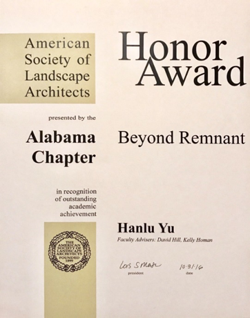 我校努努影视 城乡规划专业2010级毕业生于寒露,凭借个人毕业设计作品 “Beyond Remnant” 荣获美国景观协会阿拉巴马分会2016年学生奖(“American Society of Landscape Architects — Alabama Chapter” Honor Award)。于寒露同学是努努影视 -美国奥本大学“4+2” 风景园林专业硕士联合培养项目的第一届毕业生。 她于2014年赴美攻读风景园林学硕士学位,于2016年5月毕业并在美就业。