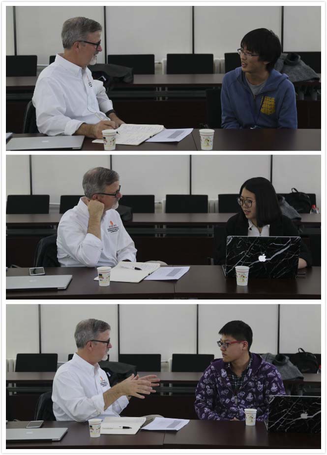 下午,David Hinson教授为风景园林专业部分大一至大四年级的同学们进行了招生宣讲,并就同学们关于“4+2”项目的问题逐一解答。最后,他为准备申请2017年“4+2”项目的6名同学进行了一对一面试,考察个人英语表达能力、作品集水平以及申请准备情况,并向他们提供了及时详细的反馈与指导。