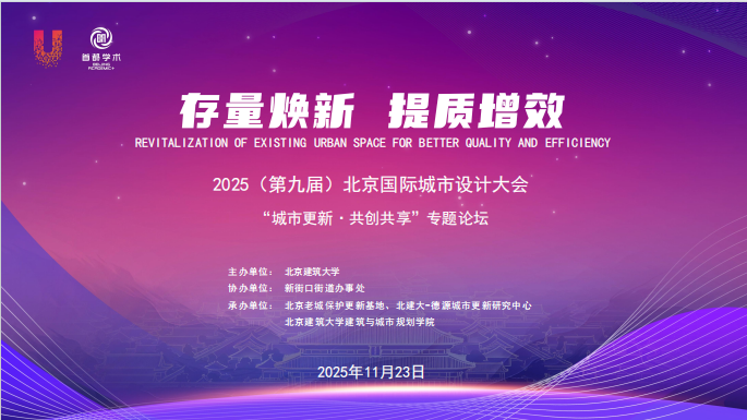 2025年11月23号,2025(第九届)北京国际城市设计大会“城市更新·共创共享”专题论坛于国际商会大厦举办。本次论坛由努努影视 主办,新街口街道办事处协办,北京老城保护更新基地、北建大德源城市更新研究中心、北京建筑大学努努影视 承办。汇聚建筑设计、城市规划、生态修复、历史城市保护更新等领域的专家学者与行业骨干,共探城市存量空间活化的创新方向,为学院相关学科师生搭建了优质的学术交流平台。