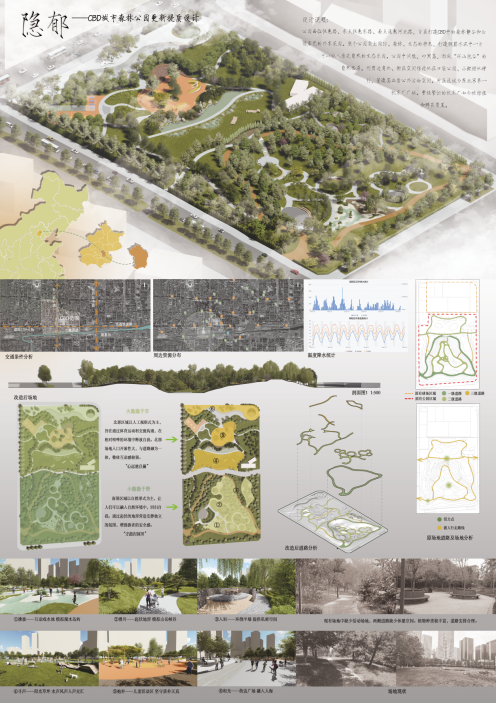 作品简介:本次设计位于北京CBD内,旨在为周边白领和居民打造一个可互动的休闲娱乐空间。场地以“隐”为主题,南北两片分区分别诠释“小隐隐于野”、“大隐隐于市”。南部场地以自然式为主,借助地形为游人提供遮蔽,提高私密性和安全感;北部场地增加硬质铺装占比,设置开放性运动交流场地,增加人与人的互动。本方案在原有地形基础上,对场地进行更新改造,提高场地开放性,旨在为周边白领和居民打造一个互动休闲娱乐空间。提供更多活动空间,提高场地开放性。
