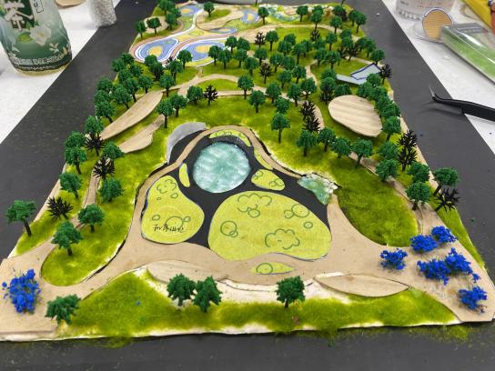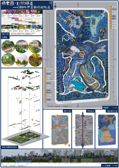 作品简介:选取中国画《独乐园》作为骨架,将其中的八景融入设计里面。本次景观设计题目为叫独乐园·松间悟道,是因为考虑到原植物配置带来的沉心静气氛围,达到“在松林中悟道,于楼宇间独乐”的境界。通过构造自然的地形起伏设计水景和种植各类树木花草,,种植选择具有地方特色的植物,如紫薇、丁香、合欢等。在增加方案整体在提高场地绿地面积的同时,使得入口、水景、林间节点、阶梯舞台、景墙、南侧水体在一条景观轴线上,呈现出四季有景的美丽景致,体现具有出中国传统文化美学的空间。