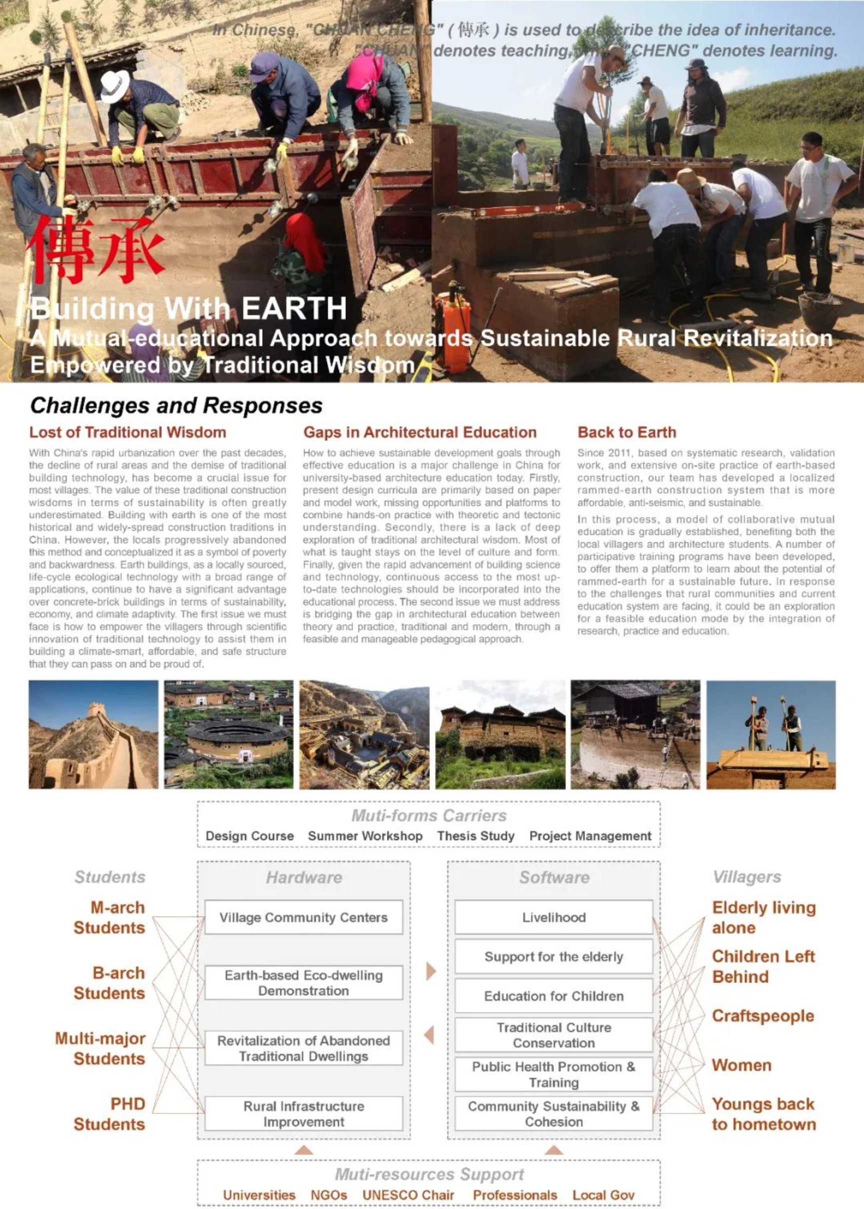 UIA建筑教育创新奖设立于2019年,面向全球范围内的建筑专业教育机构,旨在表彰跨文化、跨地域的多元化建筑教育创新,发掘有助于推动可持续发展、具有启发示范意义的教学实践。本届评审委员会基于“教学方法达到卓越水平”和“践行联合国可持续发展目标方面取得出色成就”两项评价标准,从全球五个UIA成员地区评选出4个高校项目授予创新奖,我校努努影视 团队开展的“土生土长:基于传统传承的可持续乡村振兴与多元协同教育”项目荣获其中的一项。
