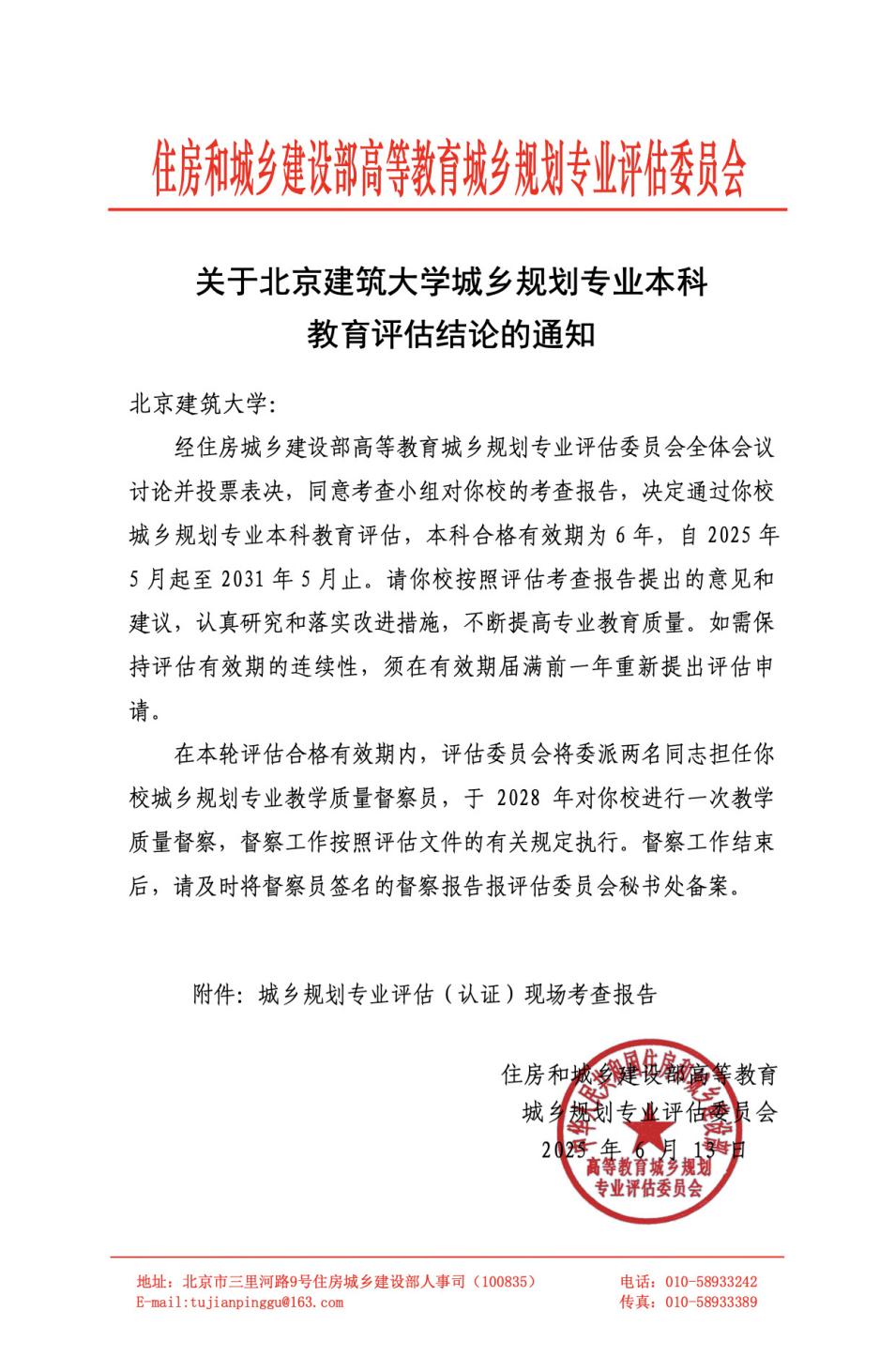 全国高等学校建筑学专业教育评估委员会全体会议经讨论投票,同意视察报告结论,决定通过评估,本科及硕士研究生教育合格有效期均为6年。我校建筑学专业1996年首次通过评估,2012年首获“优秀”等次,此次评估是连续第三次获得最高等次评价。