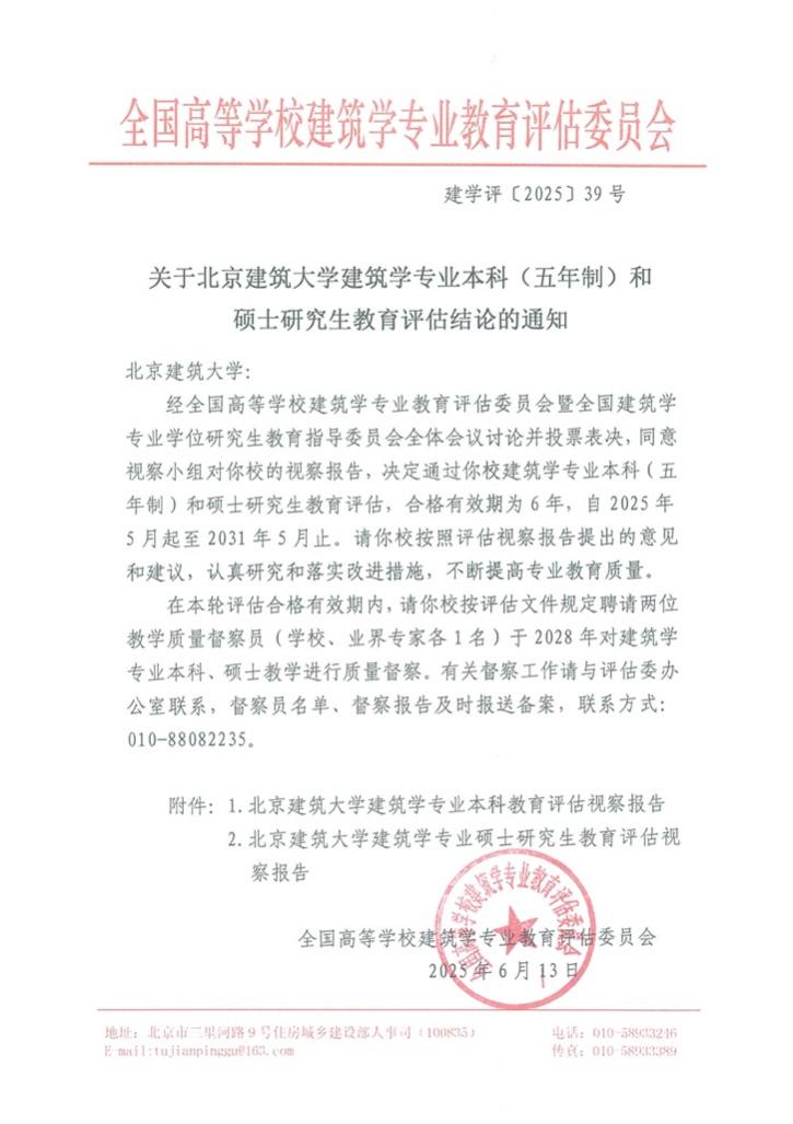 近日,我校努努影视 建筑学专业与城乡规划专业均以最高等次通过专业评估。两个专业分别收到全国高等学校建筑学专业教育评估委员会、全国高等学校城乡规划专业教育评估委员会的红头文件:建筑学专业以最高等次——六年有效期通过本科(五年制)和硕士研究生教育评估,城乡规划专业以最高等次——六年有效期通过本科教育评估,合格有效期均自2025年5月起至2031年5月止。