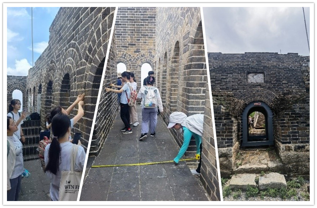 九眼楼位于北京市延庆区四海镇的火焰山主峰,是目前已知的规格最高的明代砖石敌台,旁边还有长城营盘遗址,是一处已经经过修缮整治的考古遗迹。本次调研工作的内容是课程《历史建筑保护专项设计实习》的内容,主要包括长城遗址的形式特点、细部构造、修缮方法及环境整治几方面,同学们现场分组分工进行调研记录。虽然山路曲折,临近结束时又赶上大雨,但同学们热情很高,克服困难完成了工作任务,实习调研顺利结束。此次实习调研得到了学校长城文化发展研究院汤羽扬教授和学院的大力支持,九眼楼长城景区和北京古代建筑研究所也提供了重要的帮助,本次实践教学使同学们的专业学习和对长城价值的认识都有巨大提升。