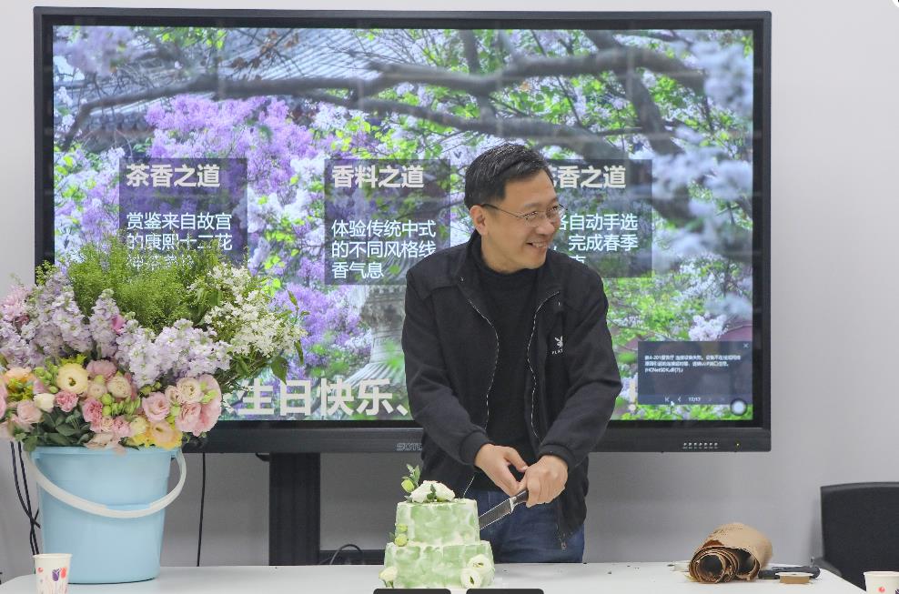 以此三香,主持人向四月生日的每位老师送上了诚挚的祝福。特邀嘉宾韩风老师为寿星们颁发“生日福笺”,2025年度的“生日福笺”由丁奇老师书写。在欢乐的氛围中,寿星代表陈雳老师开始切本月精心准备的春日花朵主题蛋糕,各位老师在品尝蛋糕美食过程中相互欣赏各自的生日礼物,也尝试着花道配色,感受着春意的氛围。