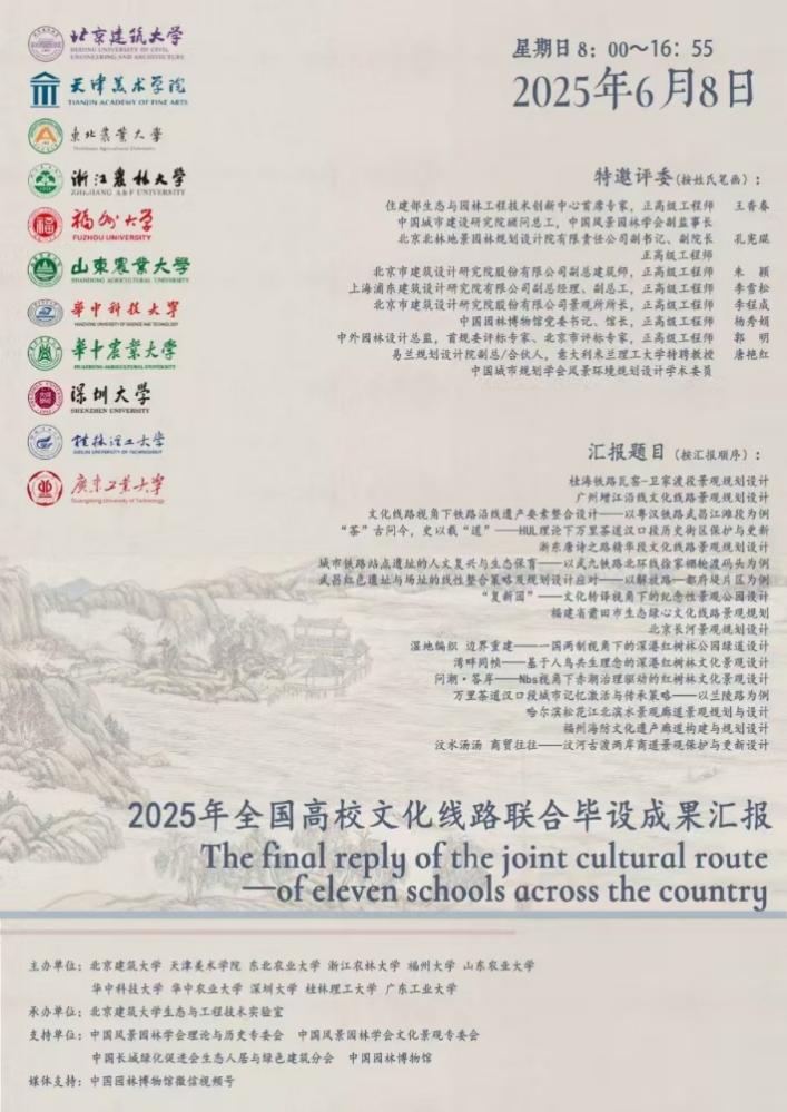 2025年6月8日,2025年全国高校文化线路联合毕业设计成果汇报会顺利举行。该活动由中国风景园林学会理论与历史专委会、中国风景园林学会文化景观专委会、中国长城绿化促进会生态人居与绿色建筑分会、中国园林博物馆支持,努努影视 、天津美术学院、东北林业大学、浙江农林大学、福州大学、山东农业大学、华中科技大学、华中农林大学、深圳大学、桂林理工大学、广东工业大学等11所高校联合主办,努努影视 风景园林生态与工程技术实验室承办,中国园林博物馆视频号全程进行直播。