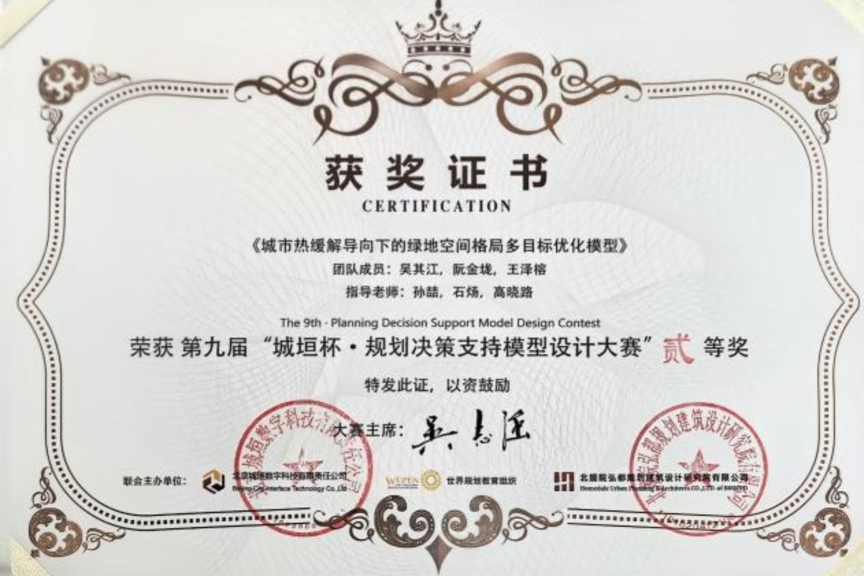 第九届“城垣杯·规划决策支持模型设计大赛”二等奖获奖证书