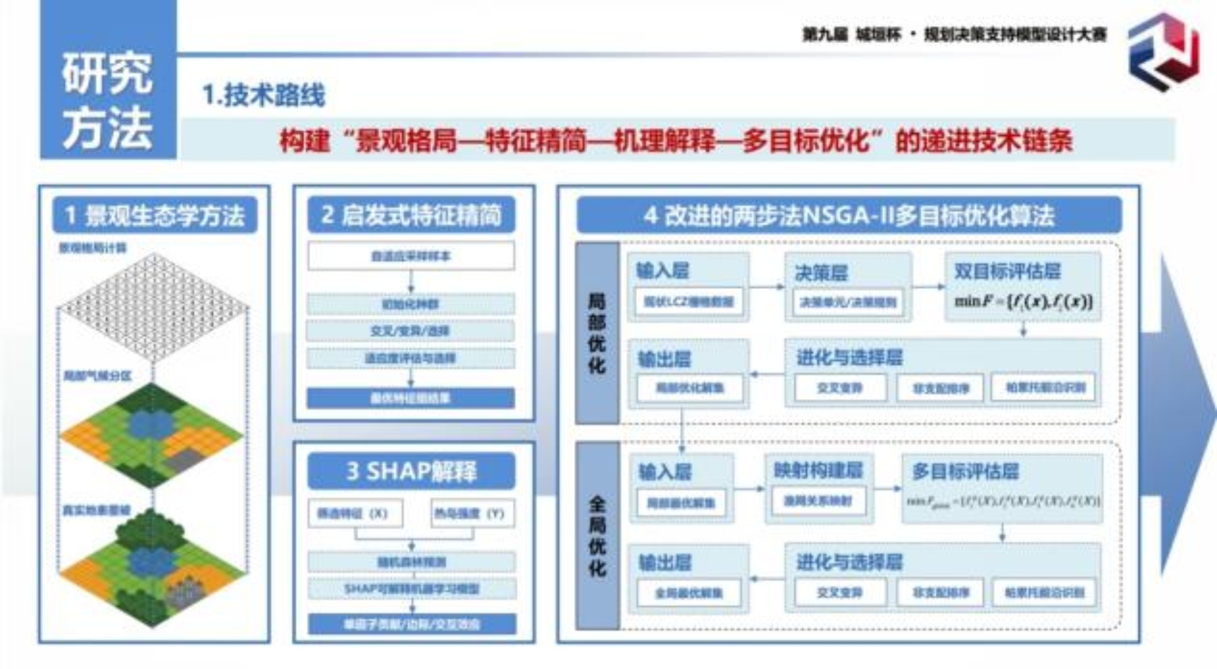 随着城市化进程加速,我国超过66%的人口居住在城市地区,城市热岛强度以每年0.021°C的速度增加,严重威胁居民健康和生活质量。本项目面向“城市热环境缓解”这一紧迫需求,提出一套针对绿地空间格局的多目标优化技术体系。首先,以景观生态学为理论基底,结合LCZ分类与LST温度数据,构建包含75项景观指标与SUHII热岛强度的高分辨率数据集;经邻域一致性自适应采样后,保证样本空间代表性。其次,采用遗传算法-随机森林耦合的特征筛选框架,在保证模型精度(R²≈0.75)的同时将特征压缩至最优子集,并通过SHAP量化各指标对降温效应的非线性贡献,解决“黑箱”难题。进一步提出“由下至上”的两步式NSGA-II优化策略:局部层面以1km网格双目标(最小SUHII、最小用地变更)搜索Pareto解;全局层面整合局部方案,扩展为四目标(平均降温、极端高温控制、建设成本、绿地增量)寻优,实现多尺度协同。北京城区实证表明,外环带状密林连片化与中心微绿化互补可整体降低热岛0.9°C以上,并在绿地增幅控制15%内显著抑制高温热点。
