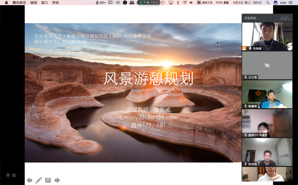 2021年3月3日上午,风景园林系系主任张振威副教授主讲的《风景游憩规划》课程成功地完成了第一周的线上授课第一课。首先,张振威老师介绍了本课程设置的目的、教学安排,随后通过师生的互动问答,让同学们更加深入地理解了课程的基本概念和理论。新学期依始,同学们学习面貌良好,全部出勤,并在课上积极思考和回答问题,给予了老师积极反馈,整个课程展现了风景园林系教师和同学的新学期新面貌。