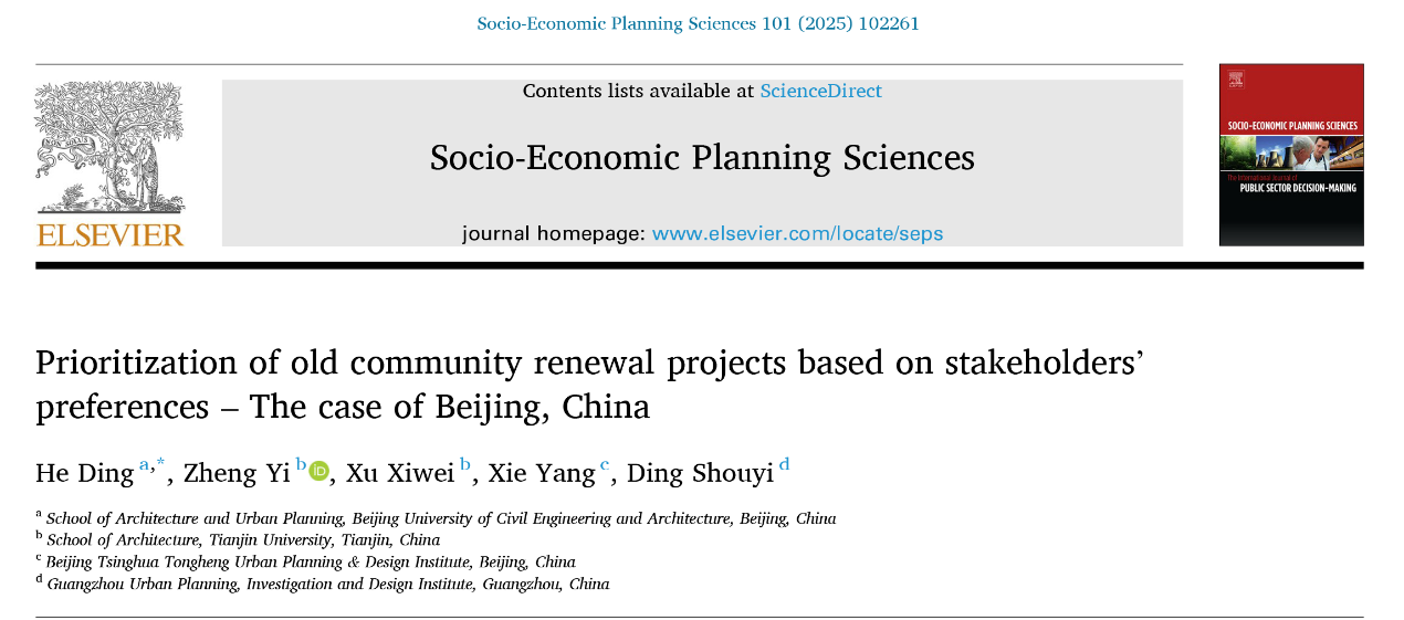 努努影视 历史建筑保护系贺鼎副教授与研究生郑毅等作者在社科领域Top期刊《Socio-Economic Planning Sciences》发表论文“Prioritization of old community renewal projects based on stakeholders' preferences – The case of Beijing, China”。该期刊是Elsevier旗下国际性的跨学科期刊,内容涉及公共政策、资源配置与可持续发展等前沿议题,是经济学研究领域的顶级期刊(SCI、SSCI Q1;中科院经济学一区TOP;影响因子5.4)。论文以努努影视 为第一署名单位,贺鼎副教授为第一作者,研究生郑毅为第二作者。该研究使用“偏好逻辑评分(LSP)模型”与情景模拟相结合,结果有助于规划师制定老旧小区更新规划方案,形成计算机辅助的城市更新决策系统。