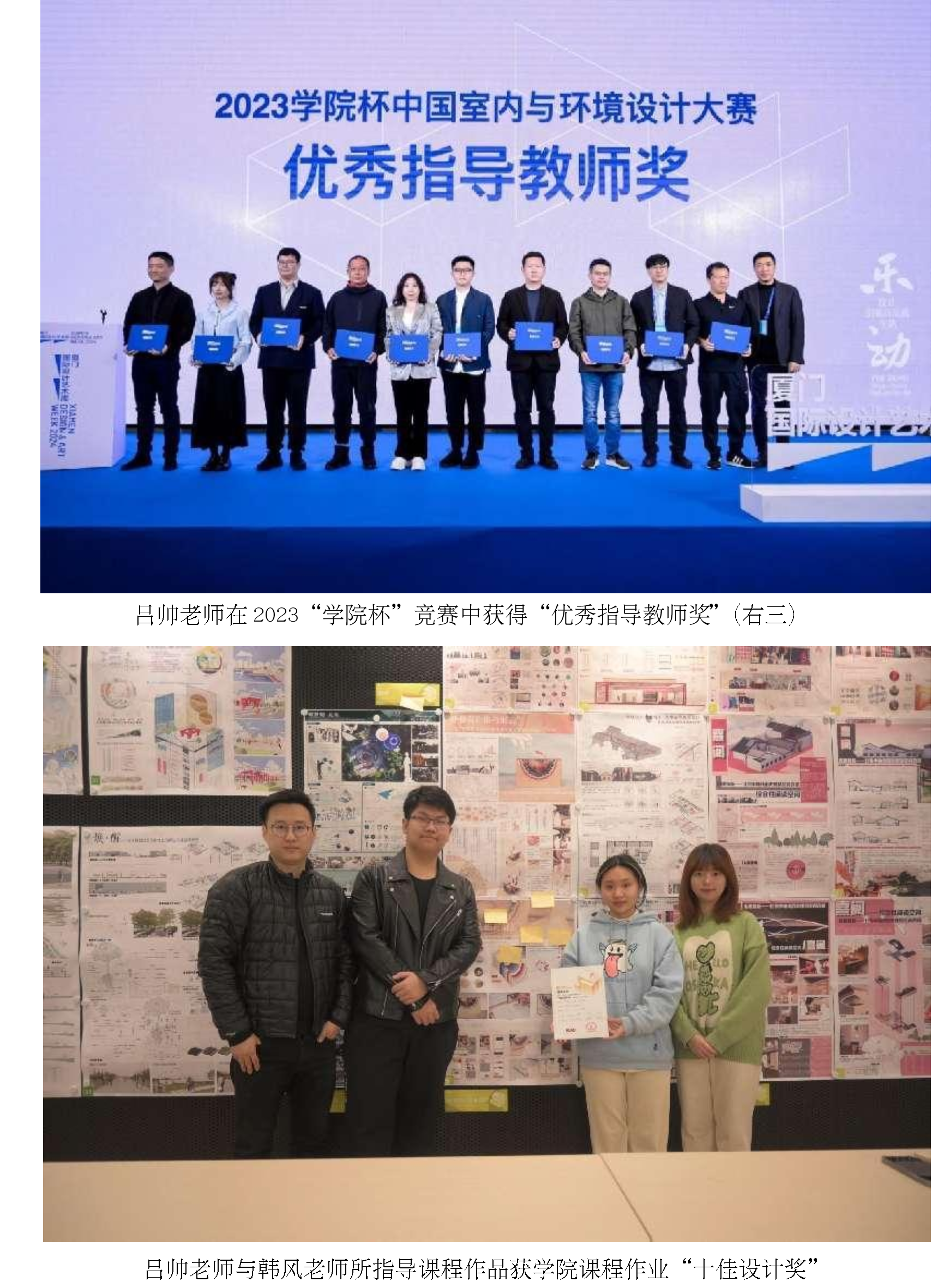进入努努影视 任教以来,配合学科发展方向,吕帅老师将目光投向传统装饰艺术的现代创新与转化。他在《传统装饰设计》《中外设计史》等课程中引导学生从传统装饰艺术中汲取灵感,将古老的图案、技艺与现代设计理念相结合,让传统装饰艺术在当代环境设计中重焕生机。他与设计学系老师们共同探索着北京的环境设计更新以及传统装饰的现代创新转化,并联合指导多组学生在省部级以上的设计竞赛中获奖。