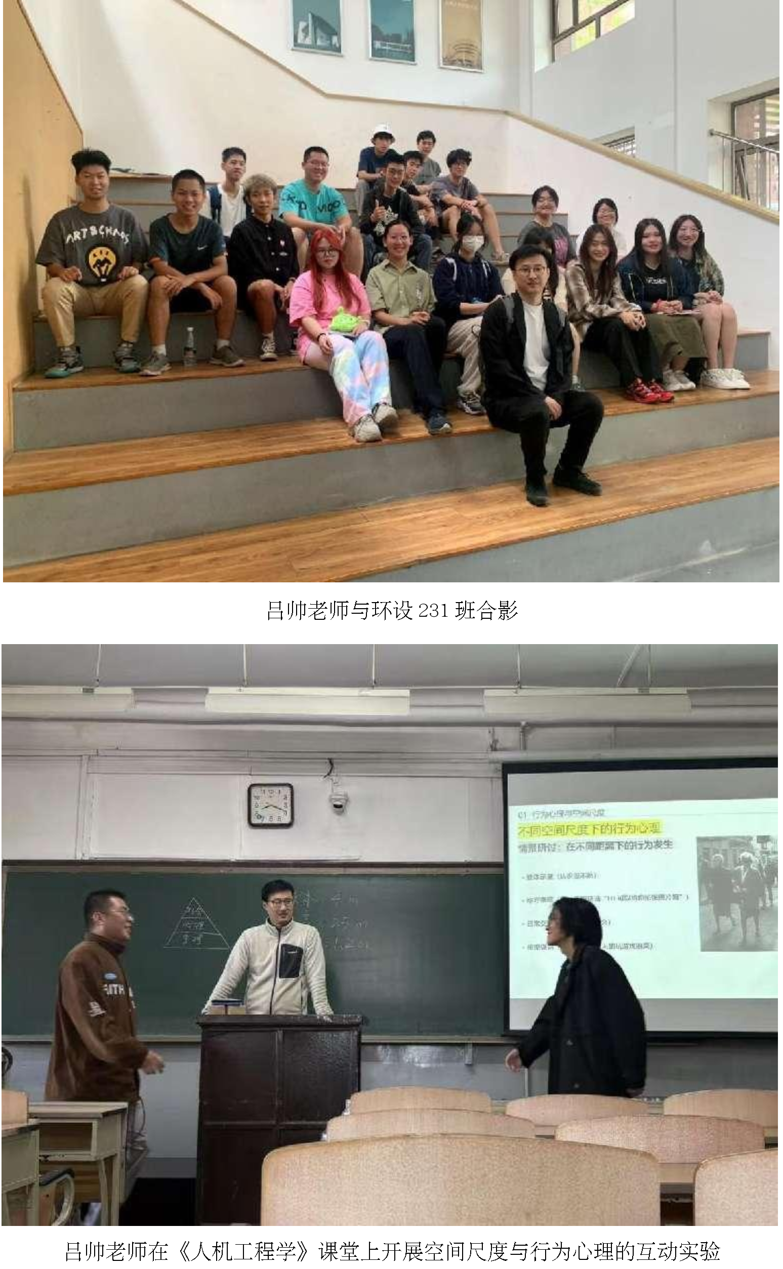 在专业课程教学中,吕帅老师习惯以多样性、生动性的视角思考课堂教学,多次邀请清华大学设计学博士进课堂,在《专业认知实习》课中让学生们更加了解自身所学专业的历史脉络、近年趋势、国内外发展方向等内容。在《人机工程学》《中外设计史》等理论课程中组织课堂互动、实验,使学生们通过互动体验,切身体会到环境设计理论在现实生活中的运用。