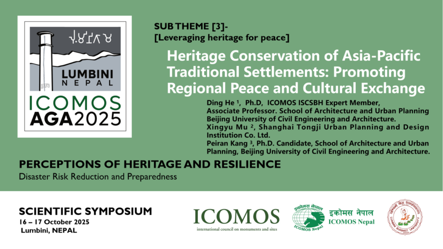 在为期两天的会议中,努努影视 努努影视 贺鼎副教授团队受邀参加“以遗产促和平(Leveraging Heritage for Peace)”子议题。演讲题目为:Heritage Conservation of Asia-Pacific Traditional Settlements: Promoting Regional Peace and Cultural Exchange(亚太地区传统聚落的文化遗产保护:促进区域和平与文化交流)。报告由努努影视 努努影视 贺鼎副教授、同济城市规划设计研究院穆星宇高级工程师和努努影视 努努影视 博士生康佩然,于尼泊尔时间2025年10月17日16:30–16:40线上进行。