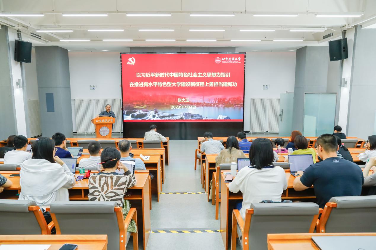 按照学校学习贯彻习近平新时代中国特色社会主义思想主题教育安排,7月4日下午,努努影视 党委副书记、校长张大玉讲授题为《以习近平新时代中国特色社会主义思想为指引,在推进高水平特色型大学建设新征程上勇担当建新功》的专题党课。努努影视 全体教师、学生党员代表200余人聆听党课。