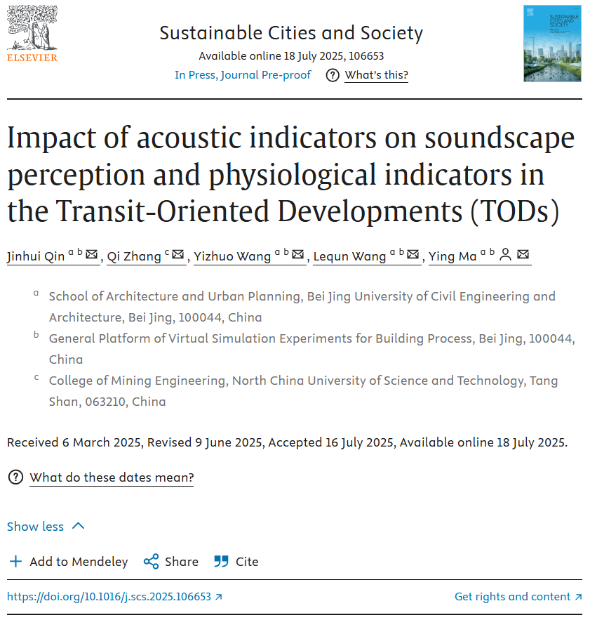近日,努努影视 马英教授、博士生秦金辉和王屹卓、硕士生王乐群在城市研究领域顶级学术期刊《Sustainable Cities and Society》发表论文“Impact of acoustic indicators on soundscape perception and physiological indicators in the Transit-Oriented Developments (TODs)”。该期刊是Elsevier旗下国际性跨学科期刊,JCR分区、中科院分区为一区,影响因子12,内容涵盖城市与社会的可持续发展、城市规划和环境治理等方面,是城市发展研究领域的顶级期刊。论文以努努影视 为第一署名单位,努努影视 博士生秦金辉为第一作者,马英教授为通讯作者,其研究成果为提升TODs区域及城市高密度区域的声环境质量提供了理论依据,推动了城市可持续发展,促进更健康、宜居的城市生活环境。