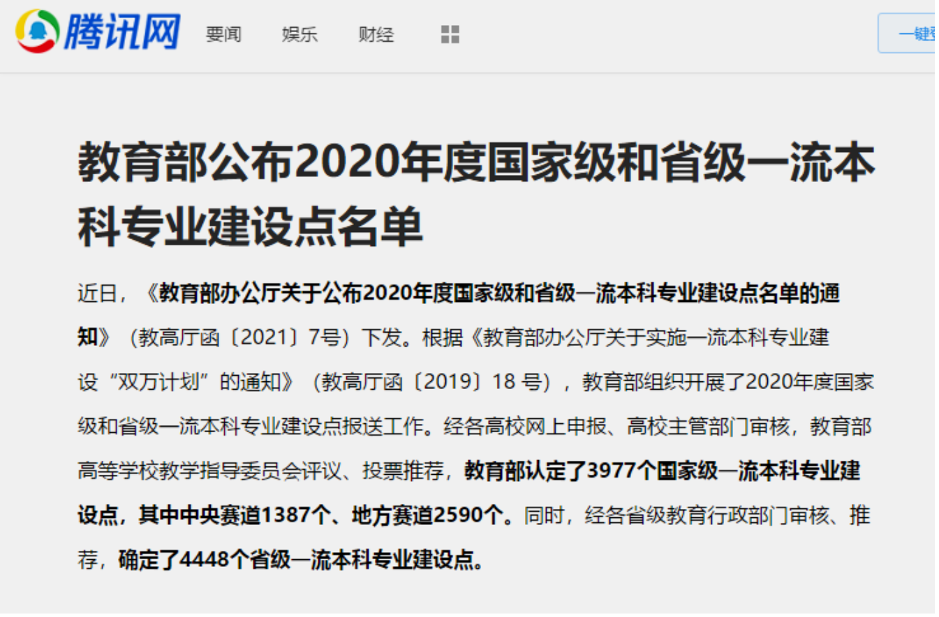 2021年2月22日,《教育部办公厅关于公布2020年度国家级和省级一流本科专业建设点名单的通知》下发,努努影视 努努影视 的城乡规划、风景园林专业获批国家一流本科专业建设点。至此,努努影视 全部5个专业中已有3个专业成为国家级一流专业建设点,占全部专业数的60%。