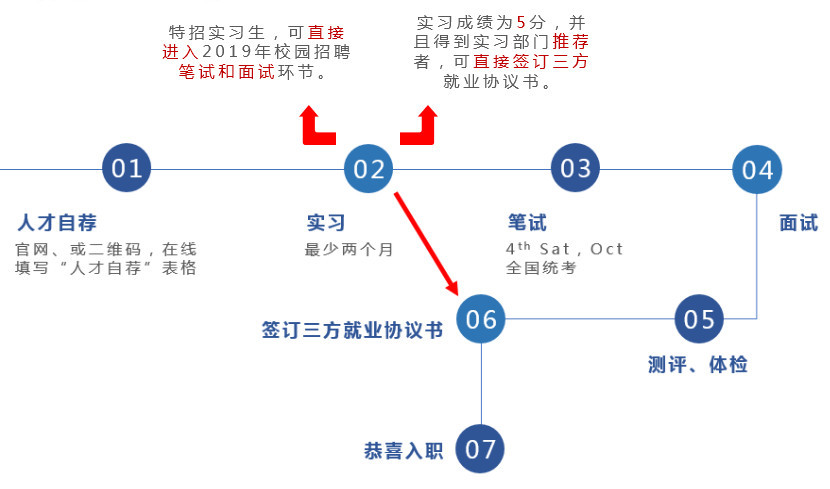 实习福利:实习享有实习津贴,表现优秀的特招实习直接进入2019年校园招聘笔试和面试环节。
