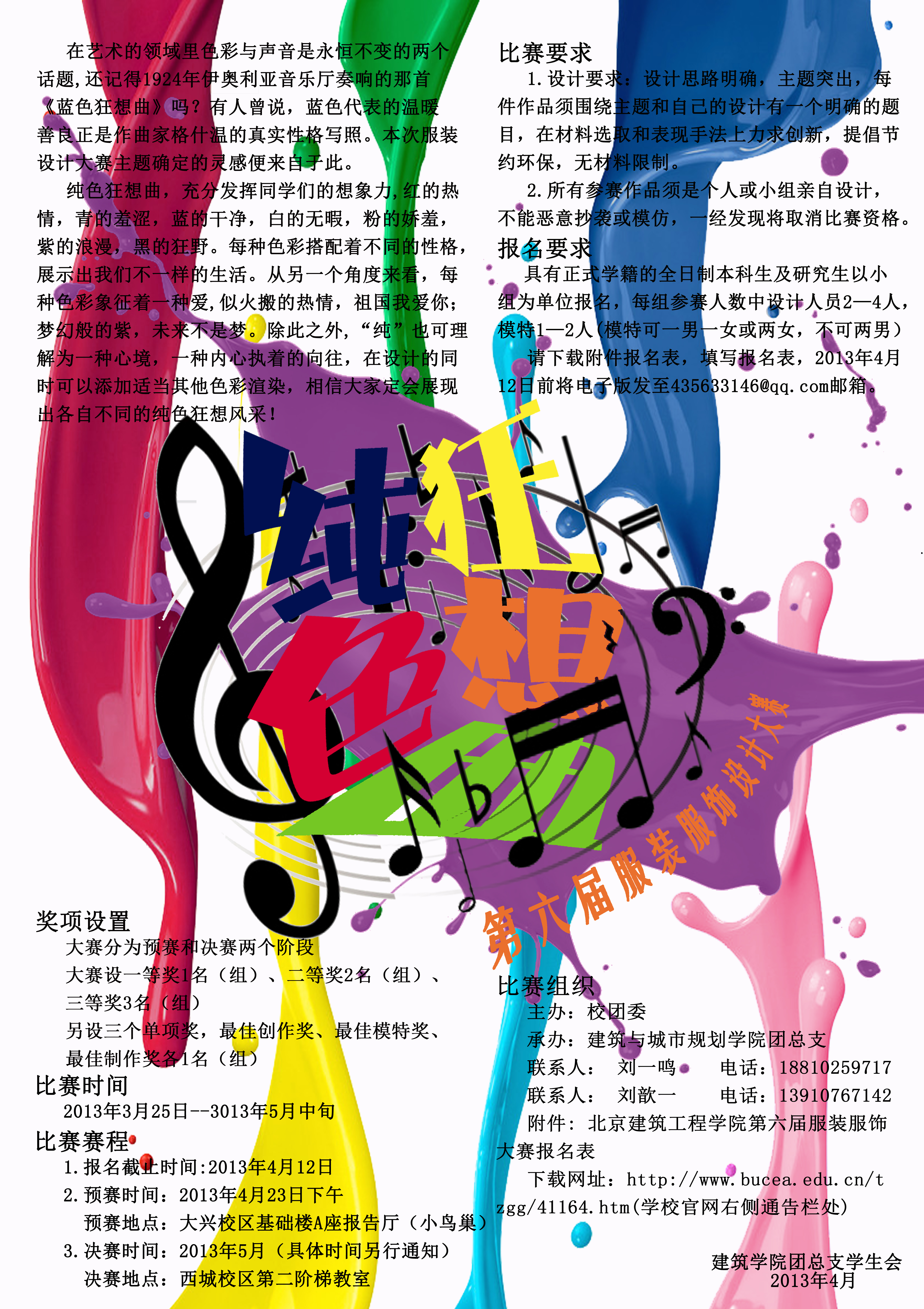 » 北京建筑工程学院“2013年‘纯色狂想曲’第六届服装服饰大赛”活动通知