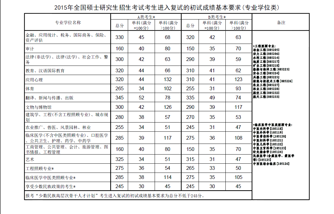 2015年全国硕士研究生招生考试考生进入复试的初试成绩基本要求(专业学位类)