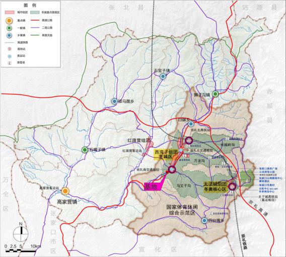 规划场地处崇礼城区南端,西湾子镇干沟村、上下两间房村区域,场地距崇城区中心区约4km,张承高速入口从规划场地中部穿过。